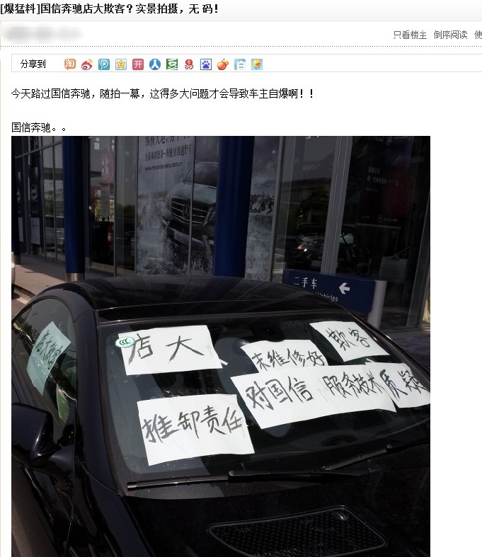 国信奔驰维修不给力 车主堵门讨说法 中国经济网 中国经济网官方账号 2012.05.1414:03 关注 近日有网友爆料,无锡一奔驰车主因为4S店维修不善、售后服质量差,一怒之下将奔驰车开到4S店门口,要讨个说法。据了解,这是一起因汽车检修而引起的维权纠纷。 (责任编辑:郭彩萍)