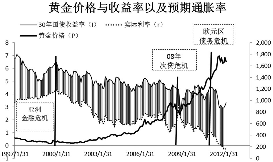 1997年—2012年黄金价格与利率、通货膨胀率之间的关系