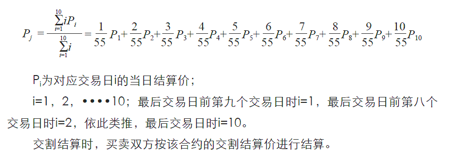 燃料油期货的交割结算价(Pj)是燃料油期货交割结算的基准价,为该合约最 后10个交易日按照时间的加权平均价。具体公式如下: