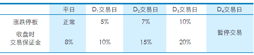 措施一:D4交易日,交易所决定并公告在D5交易日采取单边或双边、同比例 或不同比例、部分会员或全部会员提高交易保证金,暂停部分会员或全部会员开 新仓,调整涨跌停板幅度,限制出金,限期平仓,强行平仓等措施中的一种或多 种化解市场风险,但调整后的涨跌停板幅度不超过20%。在交易所宣布调整保证 金水平之后,保证金不足者须在D5交易日开市前追加到位。若D5交易日该期货合 约的涨跌幅度未达到当日涨跌停板,则D6交易日该期货合约的涨跌停板和交易保 证金比例均恢复正常水平;若D5交易日该期货合约的涨跌幅度与D3交易日同方向 再达到当日涨跌停板,则交易所宣布为异常情况,并按有关规定采取风险控制措 施;若D5交易日该期货合约的涨跌幅度与D3交易日反方向达到当日涨跌停板,则 视作新一轮单边市开始,该日即视为D1交易日,下一日交易保证金和涨跌停板参 照《上海期货交易所风险控制管理办法》第十二条规定执行。