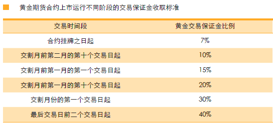 交易所实行交易保证金制度。黄金期货合约的最低交易保证金为合约价值的7%。