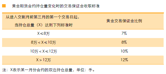 交易所根据黄金期货合约持仓的不同数量调整交易保证金,调整方法如下: