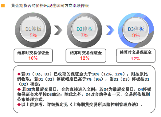 当某黄金合约连续出现同一方向涨(跌)停板单边无连续报价情况时,交易 所将按照《上海期货交易所风险控制管理办法》等有关规定采取相应措施。