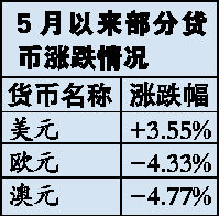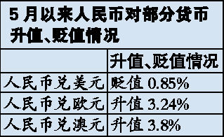 昨日,欧元兑人民币汇率中间价报8.0260,相对于5初的8.2859,已经累计升值3.24%。澳元兑人民币汇率中间价报6.2378,自5月以累计升值3.8%。
