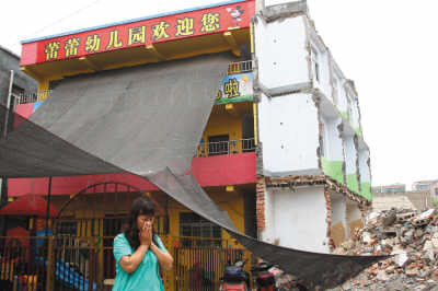 5月23日下午,记者在位于郑州市郑上路与西环路交叉口北侧路西看到,蕾蕾幼儿园的标语高高悬挂在一座拆迁了一半的楼体上,楼前拉了黑色的遮阳网,活动场地四周加装了护栏,20多名幼儿在老师的带领下排练“六一”节目。旁边高高堆起的建筑垃圾上,不时有石块滑落。不远处的拆迁废墟上,错综排列的电线低垂着,电表箱挂在拆了一半的房子墙壁上。记者采访时得知,该幼儿园还没有办理证件,官方已下达停止办园通知,但教学活动仍在进行。