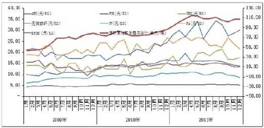 道恩股份生产产品的原材料PP、ABS、PE等多为合成树脂,市场价格受到石油价格波动影响较大。实际上,从2009年初到2011年末,国际原油现货价格由50美元/桶左右,上涨到100美元/桶左右,而上述原材料价格也相应有所上涨(如下图所示)。