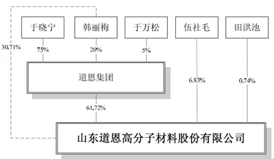 但实际上,道恩集团是由于晓宁一家完全控制的企业。招股书显示,于晓宁、韩丽梅、于万松分别持有道恩集团75%、20%、5%的股份,韩丽梅为于晓宁妻子,于万松为于晓宁父亲。