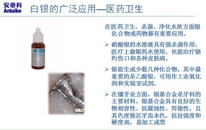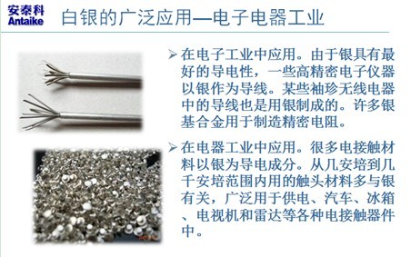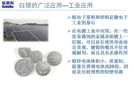 在工业应用里面还包括电子浆料和焊料,是微电子工业的基石。在这两年比较火的太阳能电池里面,银浆实际上也是作为一个最主要的部分,后面还会有一些详细的 介绍。在电镀工业当中,在一些容易腐蚀的金属表面,镀上一层银可以延长使用寿命,而且美观,镀银的餐具不仅美观耐用,而且有杀菌的作用。对于能源方面,银 芯电池体积小,质量轻,能量比普通电池高二十倍,因此是比较理想的清洁电池。