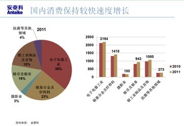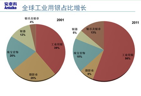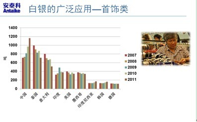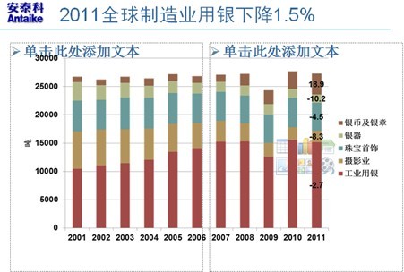 整体来说,2011年,全球制造业用银下降了1.5%,这个情况和我们的情况不同,后面有一些介绍。工业用银受到了全球工业萎靡不振的影响,同比下降了 2.7%。这里面我们也看一下2010年来说,同比2009年出现了一个较大的涨幅,2009年很明显,对于2008年由于金融危机的影响,制造业突然地 萎缩。2010年刚才提到了也是由于白银在光伏行业一个大幅度用量的增长,导致了2010年的工业用银消费量出现了一个异常的增长趋势。