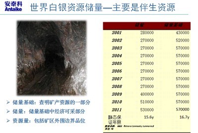那么根据美国地势调查局的数据显示,2011年全球白银的储量是达到了53万吨,那么静态保留年限是不到16年,这里边静态保留年限的意思,就是以 2011年全球生产白银3.4万吨的现状来说,目前的白银资源是仅够全球开发少于16年的,也就是显示现在实际上全球的白银资源是处于短缺的状态。这里简 单介绍三个主要的概念,看到这里有两个柱状图,可能看的不是特别清楚。这一系列显示的是全球白银的储量,第二点显示的是储量基础。那么储量基础表示的是查 明矿产资源的一部分,储量是指储量基础中的经济可采部分,资源量是包括矿区外围边界品位,这三个概念里面一个大小包容情况是,资源量要大于储量基础的,大 于储量。所以刚才提到的这个是指的储量,也就是这三个名词里面范围最小的那个。