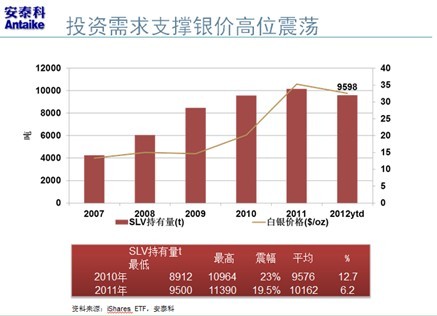 在这里我想介绍通过SLVE,全球最大的白银交易基金,通过它的持仓量显示全球近几年来白银投资需求的变化,我们看到2011年在银价暴涨到接近50美元 的大关的时候,这个持仓量也是涨到最高水平,是11390吨,2011年全年平均是在10162吨,同比增长了6.2%。2012年从年初到现在,平均持 仓量在9500吨左右,现在大概在9500吨以下,9400吨的持仓量。这个持仓量是低于2011年最高水平的,但是这个持仓量也是和2011年所持平, 这就意味着现在投资者对于白银的投资兴趣略有减少,但是它的持仓水平仍然是非常高的,也显示了对于银价的一个支撑作用。