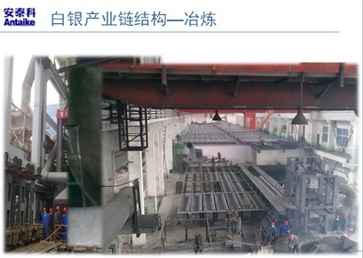 在成为金矿以后,要经过冶炼变成纯银的银锭。以铜金矿举例,铜金矿通过熔炼和金炼成为样泥铜??,最后电解就能产生黄金和白银等有价金属。这个也是显示我国比较大的冶炼厂的熔炼炉,这是一个大型冶炼厂的电解车间,我们要通过电解,从样金泥里面电解出白银和黄金。