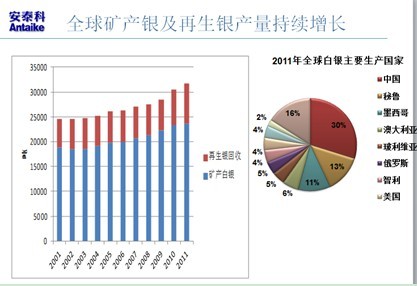 下面看一下全球的供需情况,对于全球来说,2011年全球矿产以及再生银的产量是持续增长的。2011年整个矿产银和再生银的总量突破了3100吨,同比 增长4%,是高于近十年来的产量的平均增速大概3%左右,这个受到近期银价高涨的推动,是推动产量增长的主要原因。生产白银的主要国家包括中国,秘鲁,墨 西哥,澳大利亚,玻利维亚,俄罗斯,智利,以及美国等等。这里罗列了十几家全球最主要的白银生产企业。其中最大一家比例来说就是比格比拓,比格比拓在 2011年生产白银接近1400吨,这个公司主要白银的产量都来源于他位于澳大利亚昆士兰中的一个矿山,这个矿山的名字叫开尼肯,也是全世界最大的银铅矿 山,这个矿山在2011年白银产量突破了一千吨,举一个例子比较,我国最大的白银生产企业豫光金铅,豫光金铅在2011年白银产量是695吨,实际上意味 着这个单体矿山的产量,要大于我国最大的白银企业的一个产量,这个产量是比较大的。