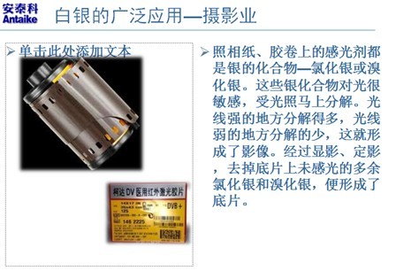 刚才提到在制造业里面,第二块主要的消费结构是摄影业,在照相纸、胶卷上的反光剂都是银的化合物,包括氯化银或者溴化银。这些银化合物对于光的敏感,受光 马上分解,光线强的地方分解得多,光线弱的地方分解得少。这个形成的影像,经过显影,电影,去掉底片上未反光的多余氯化银和溴化银便形成了底片。实际上最 近几年,由于数码技术逐渐完全取代了传统的摄影胶片的一个应用,所以摄影用银的消费量是大幅减少的。现在摄影业没有完全萎缩,最主要的消费用于医疗行业。 这里面放了一张柯达医用红外激光胶片,实际上医疗行业由于资金、设备的更替,这些原因影响这一部分的消费,我预计在近几年还不会完全地消失,所以摄影业仍 然还是用银的一个组成部分。