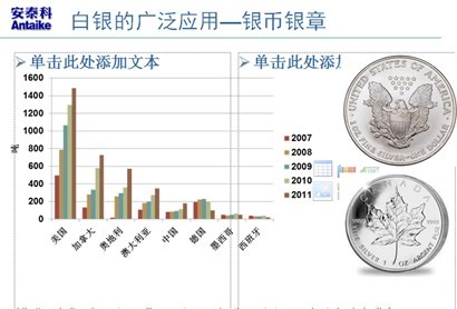 最后一部分在制造业里面主要应用是银币银章,先看右边放了两个银锭的图片,全球最主要流通的几个主要的银币,最主要流通的是美国一盎司的硬币,包括加拿大 出的枫叶币,还有澳大利亚出的银币,这些银币在2011年的销量也是大幅增长,增幅在40%以上。主要的银币和银章的消费国是美国、加拿大、奥地利、澳大 利亚、中国、德国、墨西哥、西班牙等等。