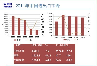 这是最后一部分,就是进出口情况,那么从2000年我国放开白银的管制以后,实际上我们每年规定一个配额数,能看到出口份额数是逐年增长的。但是我们的出 口量在2007年达到了一个峰值。在2007年以后出现了一个逐年大幅下降的趋势,主要原因是因为国家已经取消了出口退税优惠的政策,原来是完全退税,缩 减到取消了5%,到后来5%也取消掉,造成了出口的大幅度减少。从2007年已经接近了4500吨左右,骤减到2011年1170吨的水平。这也使我国从 白银的净出口国转为净进口国。能看到2011年整个的进出口的总量,能看到刚才所提到的白银的银锭的出口,2011年是1178吨,同比下降了17%。我 国也是一个主要的半制成银的进口国,是1700吨左右,同比下降44.8%,这个降幅也比较大,那么银粉是唯一出现例外的,出口,因为基数比较低,所以出 现了较大的一个增长。