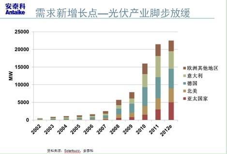 通过对于全球光伏行业的需求的表,我们看一下,光伏行业全球增长是非常的快,能看到2010年,同比2009年出现了一个需求翻倍的情况。在2011年由 于欧债危机,一些国家经济下滑的影响,取消了对于光伏行业的比对政策。比如说我们能看到需求柱状图里面最主要是来源于欧洲,欧洲主要两个国家,意大利和德 国。北美和亚太国家目前的占比比较小,预计今年到往后几年的区间,尤其中国是光伏行业里面增长点出现的最主要的一个增长点。那么刚才提到了欧洲是光伏行业 的主要需求的地区,那么也是受到欧债危机的影响,比如说意大利取消了三百家电站的补贴,比如说德国关于补贴取消的政策也是沸沸扬扬。尤其这些补贴政策的取 消以及缩减,对于2011年光伏行业产生的影响是巨大的。