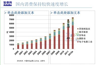 这里面放了一张十年左右国内消费的情况,我国的国内白银消费保持较快速度的增长。2000年接近1500吨,到现在2011年是接近了7000吨,增速非 常快。电子电器工业增长4.9%,摄影业下降10%,首饰业增长15%,银币银章增长10%,其他制造业增长5%。这里面看一下电子电器工业,同样和世界 的工业用银的趋势比较类似,同时在2010年出现了一个较大的增长。2011年增速是在回落的,这个增速的主要驱动的动力是来源于太阳能行业。