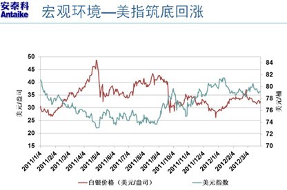 讲完黄金也要讲与白银联动性第二强的商品,就是美元指数,这里罗列了一个比较短的时间段,是从2011年到现在,就是想让大家看到的一点,他们有一个很明 显的趋势。美元指数相关的走势就是要看美国的经济,这里罗列了几个主要的美国经济指标。包括美国的GDP,从2011年的第二季度开始,还是有一个回升 的。但是现在虽然没有回升到一个最高的阶段,但是从其他的经济指标来说,比如说它的通胀,已经从最高的水平有所回落。再包括美国新建住房同比虽然是波动剧 烈的趋势,整体还是波动恢复的。对于失业率来说也是有所下降,整体的这一些经济指标,显示在2012年,美国的经济,我们认为它是一个逐渐升温的趋势。但 是昨天说的经济数据是金银价格有所回涨,这个消息是美国费城的制造业指数,又是大大地低于大家的预期,在这种情况下,又是金银价格有些抄卖的情况下,大家 越来越对美国的QE3产生了更多的预期,价格也是有所回涨的。整体来说,2012年,美元的指数走势会比较好一些,金银价格,在美元指数的压力下会承担一 定的压力。