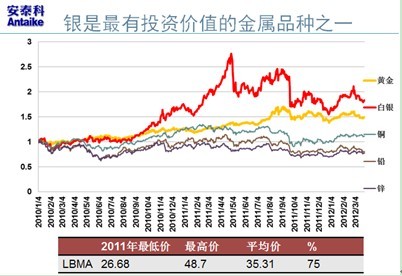 总体来说2011年国际白银最低价26.68美元,最高48.7美元,平均价是35.31美元,同比2010年的20.16美元,增长了75%,这个增幅也是比较大的。