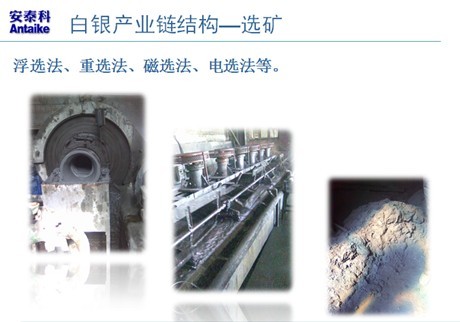 现在看一下选矿的过程,现在市场上主要运用的选矿的方法有四个,包括浮选法,重选法,磁选法以及电选法。最主要用的浮选法,采用一些化学试剂的方式。首先 看图,看到是把矿石通过打碎,加水,变成矿石的浆料,并且向浆料里面添加一些化学的试剂,有用的金属,银,还有一些其他的金属,能够浮悬到浆料产生的泡沫 里面,这个就是浮选机,在这个长单上面,有很多浮选片,这个桨是来回翻滚转动的,可以把浆料里面的泡沫,拨到旁边的槽里面,最后就产生了金银矿,这个里面 的含量已经是比较高的了。