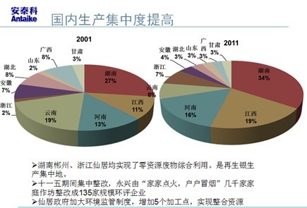 那么“十一五”期间由于环境大家都是比较关注的,这两个地方是集中整改。湖南郴州的永新由家家点火,户户冒烟的几千家家庭中,整改成135家规模化企业。 预计在“十二五”期间,这个135家将会继续减少到几十家,整改力度非常大。对于仙居政府也在这两年加大了环境监管制度,增加五个加工点,实现整合资源, 如果要是他们发现家庭作坊在自己冶炼的话,他们是会受到很严厉的处罚。