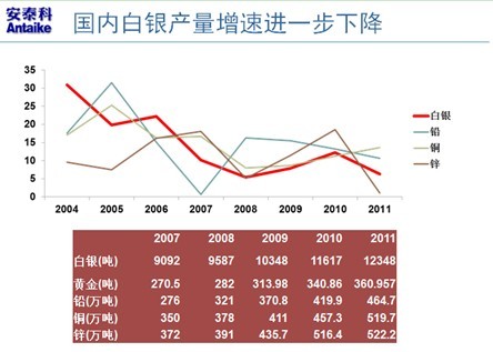 刚才介绍了全球白银的供需情况,下面看一下国内白银的供需情况,首先根据中国有色金属工业协会的数据显示,2011年白银生产12348吨,同比增长 6.8%,刚才提到了白银主要是伴生在铜铅锌矿里面,所以我们白银产量也是跟随着铜铅锌产量的变化的。上面的图表显示了铜铅锌主要基本金属的一个产量增速 的变化,我们看到呈现逐渐下降的趋势。预计“十二五”期间,也是在国家主动宏观调控的结果,预计白银产量的增速将会进一步下降,也就是产量将进一步提高, 增速将进一步减缓。