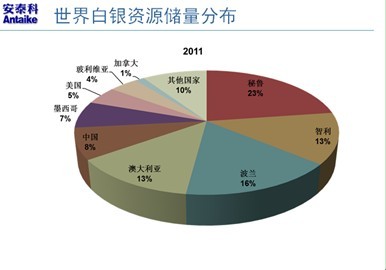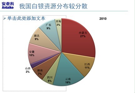 我国的白银资源分布较为分散,根据国土资源部的数据显示,2010年,我国的所有省份均发现了白银的银矿资源,当然包括独立银矿,或者是伴生银矿,仍然主 要伴生在铅锌矿里面。相对来说,我国的白银资源主要是分布在内蒙古,占27%,江西11%,云南16%,湖南7%,安徽10%,湖北,广东等等,那么内蒙 古实际上对于我们这十年全国的白银资源的一个变化趋势来说,我国的白银资源实际上是逐渐向西部转移的,那么内蒙古也是近几年来资源增量是比较快的。他这边 主要伴生在铅锌矿里面,而且在铅锌矿里面白银的品位也是比较高的,所以说实际上内蒙古的矿是比较好的。其他的呢,另外一个比较主要发现的是为近期发现的我 国的比较大型的银矿是位于四川,在四川的夏赛,这个银矿规模在五千吨的储量左右,这是大型的银矿,相对于国际上的超大型的银矿来说,规模仍然不算很大。