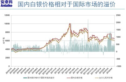 关于价格我还想用一个图表示它的特点,就是国内的白银价格相对于国内市场的议价,比较国内白银价格,以及转换之后国际白银价格的趋势,能看到国内价格与国 外价格有一个议价,但是平均在300到400元区间,实际上我认为这个议价,也给我国的投资者一个内外套利的机会,这里不详细地展开了。