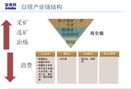 下面我们重点看一下影响白银价格的主要因素是白银的产业链结构,这里面先介绍一下产业链的情况,用一个图形来表示。上游主要包括了三个部分,主要从资源的 盈利情况,通过采矿和选矿,有没有金矿和含有金矿,通过冶炼成为纯银的银锭。下游的消费包括几个主要的方面,后面有一些详细的介绍。