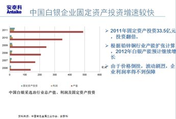 对于整个我国白银冶炼企业,上游的行业来说,2011年的特点是固定资产投资增速较快。2011年,采选冶行业固定资产投资达到了33.5亿元,根据铜铅 锌行业产权扩张的计算,2012年我国的白银产能也是继续增长的,大概增长500吨到1000吨左右。对于这个行业来说,银价格倒挂,企业的利润率不能得 到保证,这也是刚才提到的,现在有色行业整个行业利润从上游转移,谁拥有了资源,谁保证利润。对于冶炼企业来说,尤其是大型的冶炼生产商,他们在2011 年受到价格的波动,而且他们这一些白银的产量有相当的一部分,据我所知已经超过了一半。产量的资源所来的金矿是要通过进口的。大家知道金矿由于价格差,而 且对于波动比较剧烈,所以对于企业经营产生了很不好的影响。所以企业非常欢迎我国自己的期货的推出,能够进行套保,规避一些风险。