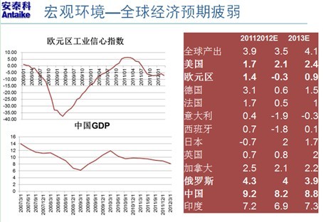 除了美国,我们认为有一个IMF国际货币基金组织在4月份出了一个最新的关于全球的经济预期,那么IMF对于全球经济预期是认为2012年的经济增长是低 于2011年的。从3.9%下降到3.5%。除了美国,以及从大地震中恢复的日本,经济是有所增长的。那么其他的主要经济体,都是经济出现了一定的下滑。 首先在欧元区,国际货币基金组织认为欧元区在2012年经济增长会出现负增长,-0.3%的一个趋势。包括主要的核心经济体,德国和法国,也能看到经济增 长的速度降到1%以下。身陷欧债危机的西班牙以及意大利也是呈现负增长的趋势。