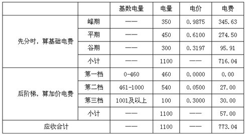(1)采用“先分时,后阶梯”计算方法。即先按照峰、平、谷各时段用电量和对应电价计算全部电量的基础电费,再按照第二档、第三档用电量及其加价标准,分别计算第二档、第三档电量的加价电费,基础电费与加价电费之和为居民总电费。