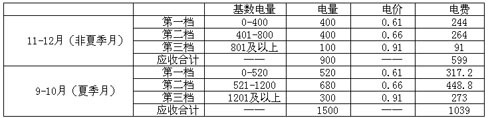 (1)抄表周期为两个月的李先生,抄表月份为1、3、5、7、9、11这6个月,其9-10月用电量为1500千瓦时,11-12月用电量为900千瓦时,分别计算其9-10、11-12月份电费(计算时不考虑公摊、免费电),如下表所示。