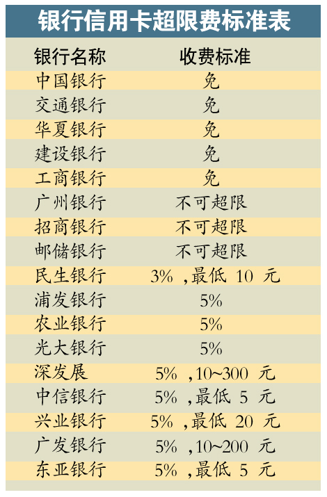 银行业内对未偿清的信用卡最低还款额会根据余额收取滞纳金作为“超限费”(俗称“罚息”)。记者调查发现,浦发银行、光大银行等多家银行均对持卡人超出信用额度的消费部分收取5%的超限费。
