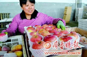烟台清田果蔬有限公司内员工正在包装苹果,为出口东南亚做准备。本报记者李娜 摄