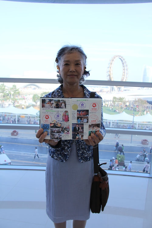 “世博奶奶”山田外美代向记者展示自己参观中国馆的照片和纪念印章。 摄影:人民网记者 马菲