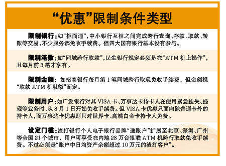 分析普遍认为,银行给出优惠条件背后都打着自己的“小算盘”,“像中小银行ATM机同城跨行取款优惠,原因是这些银行的网点和ATM机布局较少,持卡人跨行频率较高,收费太贵必须丧失客户”,一位银行业人士指出,那些对客户提出限制条件的银行,目的是为了争夺高端客户,在这些银行的盘算中,银行看中的是这些客户在其他方面给银行带来多重业务收入,这些收入远高于手续费带来的利益,“失之东隅 收之桑榆”。