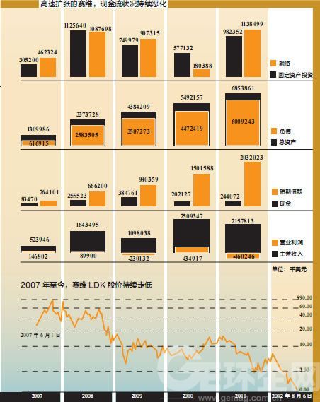 可以说,过去7年,在彭小峰的领导下,高速扩张、四处出击的赛维LDK,资金链一直处于一种相对比较紧张的状态。截至2011年底,赛维LDK手持的“现金及现金等价物”为2.44亿美元,而其“短期负债”却高达20.32亿美元。