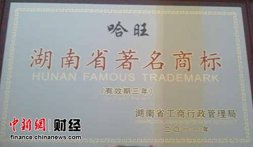 哈旺公司网站提供的图片显示,哈旺被湖南省工商行政管理局被评为湖南省著名商标。