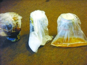 当6只饮料罐都被套好食品包装袋后,随着“噗”的声响,记者隔着包装袋,小心翼翼地将各个饮料罐打开。在饮料罐刚刚开启的瞬间,记者注意到,原本瘪瘪地贴在饮料罐上的塑料袋像是被什么吹起来似的,鼓起了一个拇指大小的鼓包。