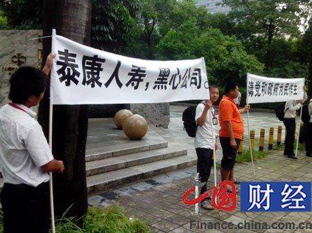 投诉人在深圳泰康人寿公司楼下进行维权活动 (图片来源:中国网)