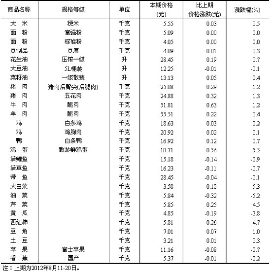 50城市主要食品平均价格变动情况(8月21-30日) 中国政府网 2012.09.0414:22 关注 50城市主要食品平均价格变动情况(8月21-30日) 来源:统计局网站责任编辑:刘万明 SF054