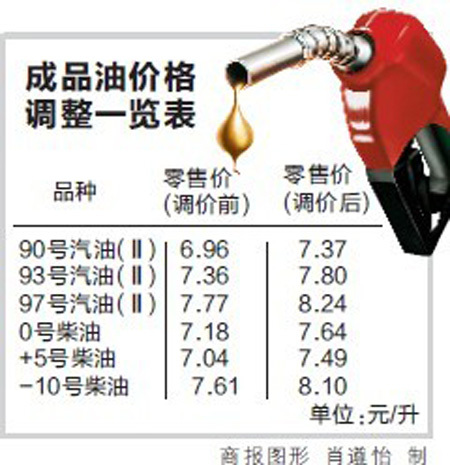 据《重庆市物价局转发<国家发展改革委关于提高成品油价格的通知>的通知》(下称《通知》)称,根据现行成品油价格形成机制,结合近期国际市场油价变动情况,综合考虑当前国内外经济形势,国家发展改革委决定上调成品油价格。《通知》要求,9月11日零时起,上调国内汽柴油最高零售价。汽油每吨上调550元,柴油每吨上调540元。调整后,我市93号汽油由之前的每升7.36元涨至7.80元,每升涨了0.44元;97号汽油由之前的每升7.77元涨至8.24元,每升涨了0.47元。