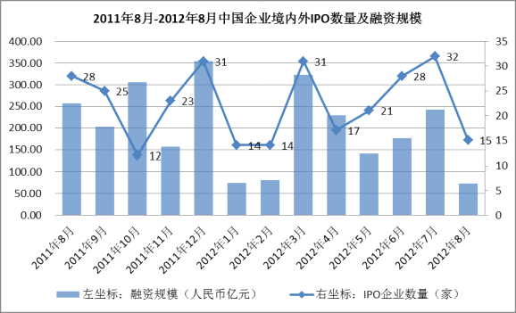 图1:2011年8月-2012年8月中国企业境内外IPO数量及融资规模