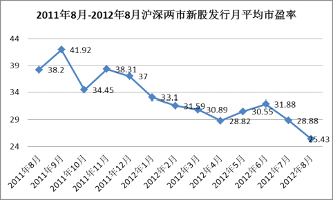 图3:2011年8月-2012年8月沪深两市新股发行月平均市盈率