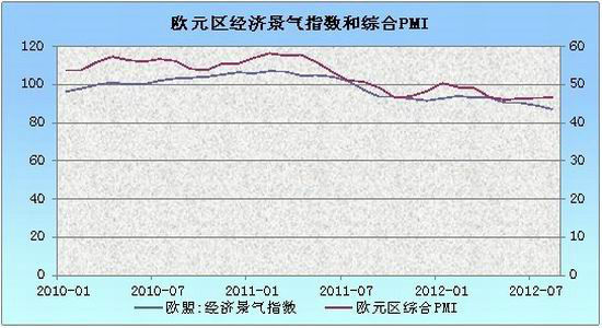 目前在全球经济面临的几大风险因素中,最大的风险因素依然是欧债危机。今年欧元区核心成员国经济增速放缓或停滞,高负债国家深陷衰退,失业人数创新高,加上欧洲主权债务危机迟迟未决,欧元区经济前景黯淡。8月份欧盟和欧元区经济景气指数(ESI)分别为87和86.1,连续5个月下滑,目前已经跌至自2009年以来的最低水平。其中,消费者、零售和建筑经理信心指数显著下降;其中欧元区服务业信心指数下降,欧盟工业信心指数下降。经济景气指数大幅下跌预示着欧盟经济不景气状态仍会持续。