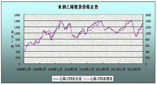 石脑油和乙烯作为原油的下游产品,走势与原油价格基本保持一致,7、8月份石脑油和乙烯价格保持强势上扬。日本石脑油从6月底的750美元/吨,已上涨至8月底的977美元/吨。7、8月份乙烯单体价格同样涨势明显,其中CFR东北亚涨42%,收于1349-1350美元/吨,CFR东南亚涨42.3%,收于1329-1330美元/吨。