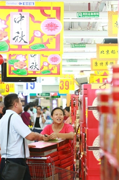 9月11——13日,记者走访京城欧尚、家乐福、法宝、京客隆、世佰家等数家超市发现,迎接中秋节的横幅已经挂了起来,各种商品的促销牌里,尤以月饼最为引人注目。