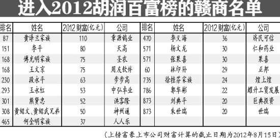 赣籍富豪财富也有逆势增长的,比如在广东创业的李平,受益于多元化投资,其财富从去年的60亿元增加到了今年的80亿元;洪客隆的熊贤忠则因为将旗下连锁商业全部销售给华润万家而较去年增加了22亿元财富;徐桂芬家族则是因为煌上煌在9月5日首发上市而上榜;在北京从事钨矿投资的刘典平也是首次上榜。
